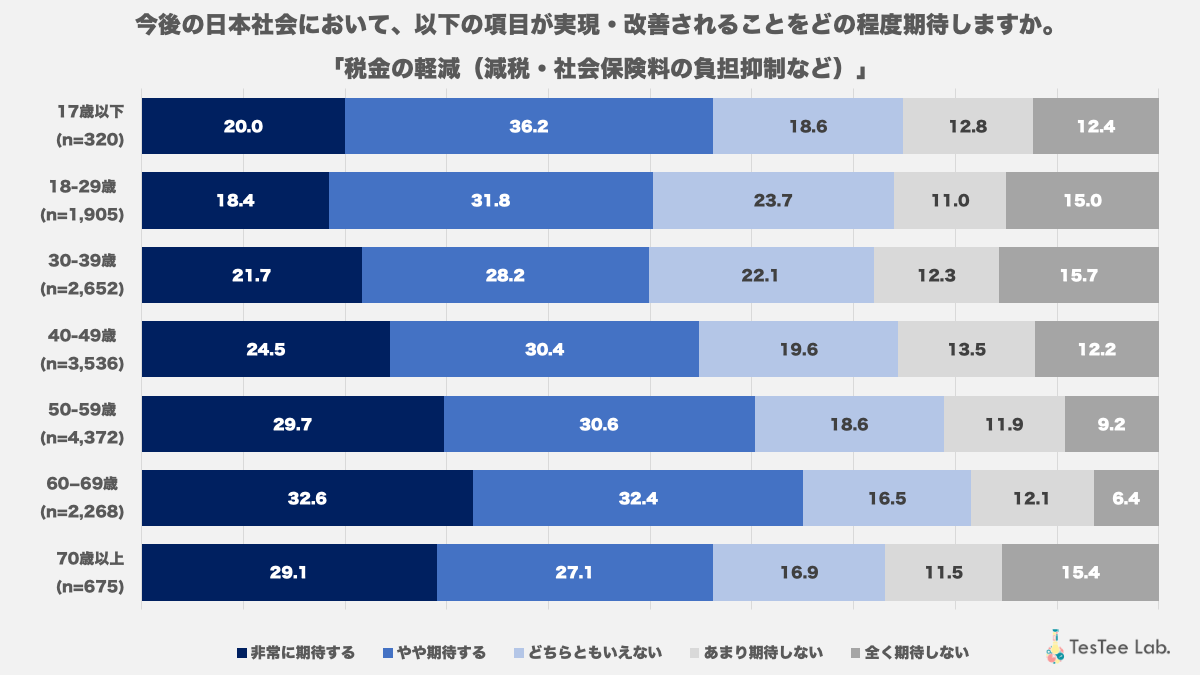「税金の軽減」では、17歳以下では「非常に期待する」が20.0%、「やや期待する」が36.2%、18-29歳では「非常に期待する」が18.4%、「やや期待する」が31.8%でした。30-39歳では「非常に期待する」が21.7%、「やや期待する」が28.2%でした。