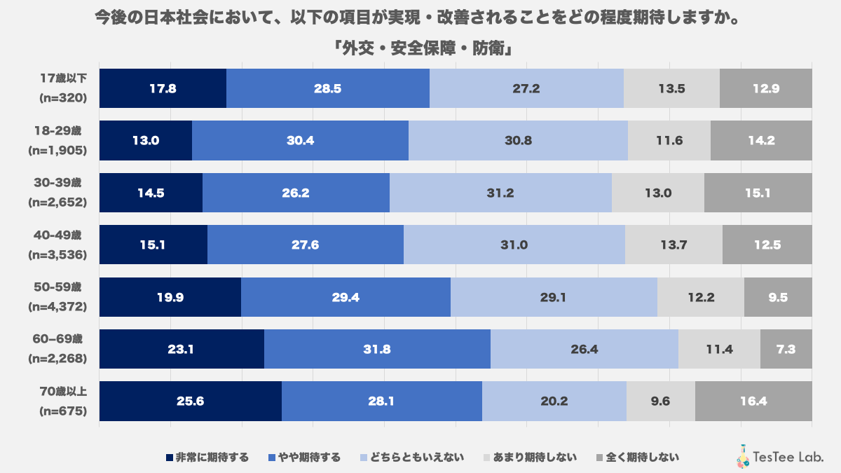 「外交・安全保障・防衛」に関しては、18-29歳では「非常に期待する」が13.0%と最も低く、「やや期待する」は30.4%でした。