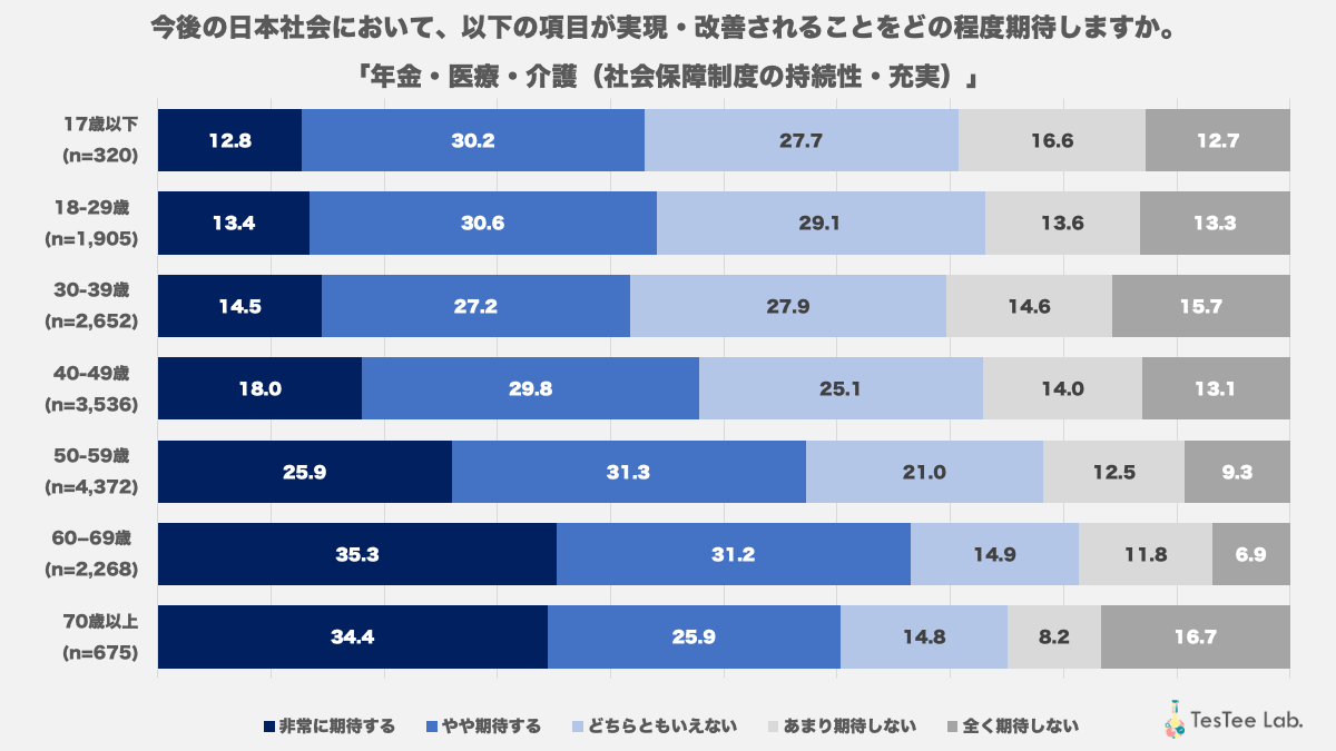「年金・医療・介護」といった社会保障制度については、特に高齢層からの期待が高い傾向になっており、60-69歳では「非常に期待する」が35.3%と突出して高く、70歳以上でも34.4%となりました。