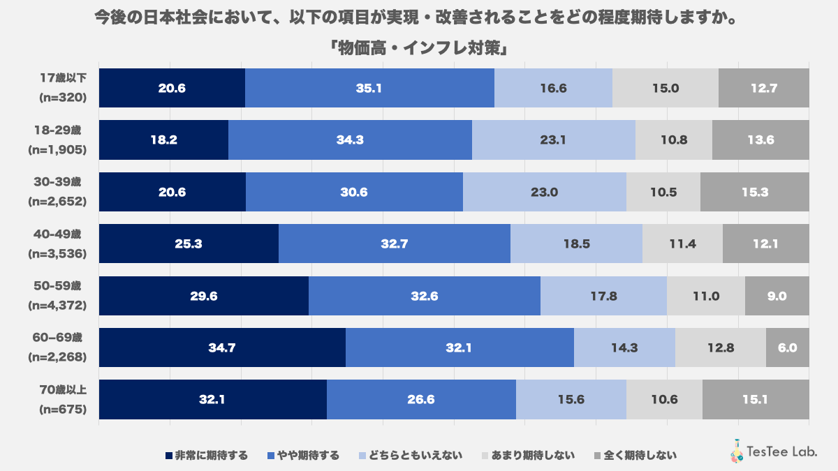 「物価高・インフレ対策」については、17歳以下では「非常に期待する」が20.6%、「やや期待する」が35.1%と、上位2項目を選んだ割合が18-29歳、30-39歳よりも高くなりました。