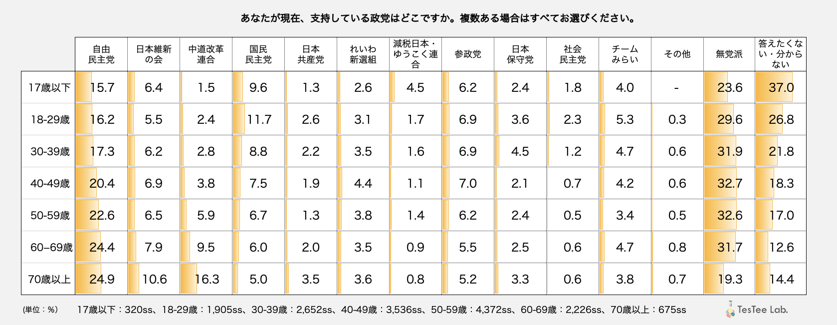17歳以下では、「支持する政党はない(無党派)」が23.6%、「答えたくない・分からない」が37.0%と、特定の支持政党を持たない層が多数を占めました。
